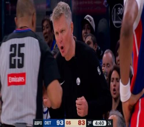 格林失误被抢断,随后向裁判投诉有犯规没有吹罚,情绪激动领到技术犯规,这只能说虽迟但到。奥萨尔防守中拍到穆迪头部,裁判回看录像后判罚一级恶意犯规,这个动作真是危险。坎宁安里突外投连拿5分,哈里斯和杜伦接连冲击篮下走上罚球线,活塞打出一波16-4攻击高潮,重新领先到17分。库里最后一攻三分命中,半场战罢,勇士64-77落后活塞13分。