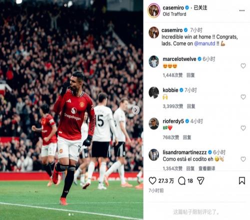 卡塞米罗社媒写道:主场绝杀取胜,太不可思议了!!恭喜兄弟们。加油曼联!!